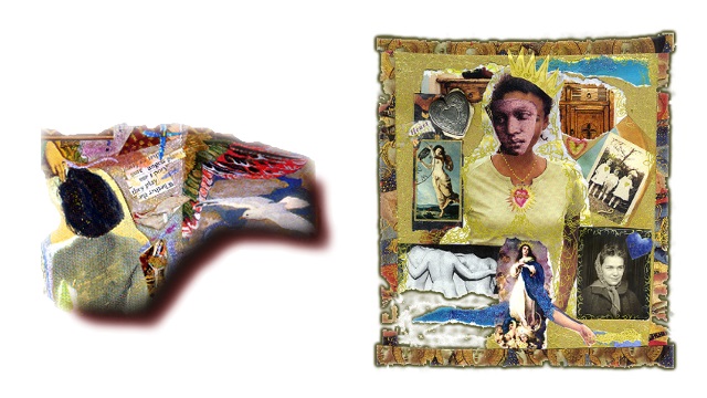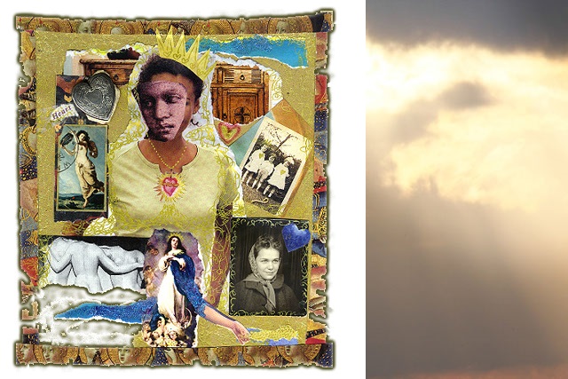 The silver locket was my mother's that has remnants of a sketch peeking out (I imagine the sketch is of her and my father, drawn by her). There is mention of generations past with the photo of my Aunt Wendy and the little black and white photo of three children above her head. The Sacred Heart hangs around the model's neck on the gold chain as the continuum of our voice, and the power of our stories, our love and our hearts.